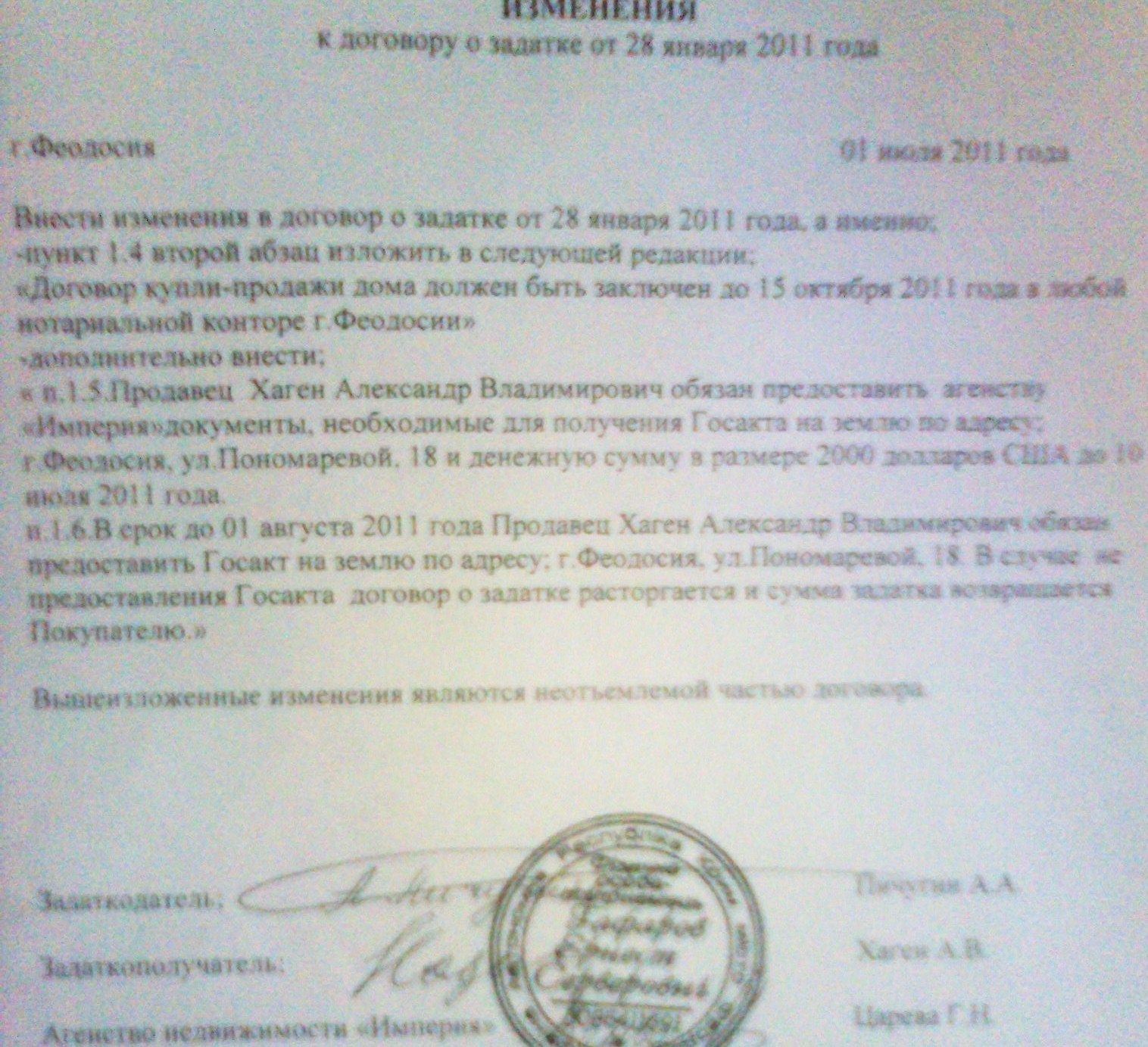 А вот как!Одно из агентств недвижимости г.Феодосии предлагает мне за две тысячи долларов решить мою проблему в течении двух недель!!!За что мы и заключили с ним договор,в котором черным по белому написано-Агентство ".Риэлторшип."(к примеру) обязуется предоставить госакт к 1му августа 2011года.Вот это по-нашенски!По украински!
