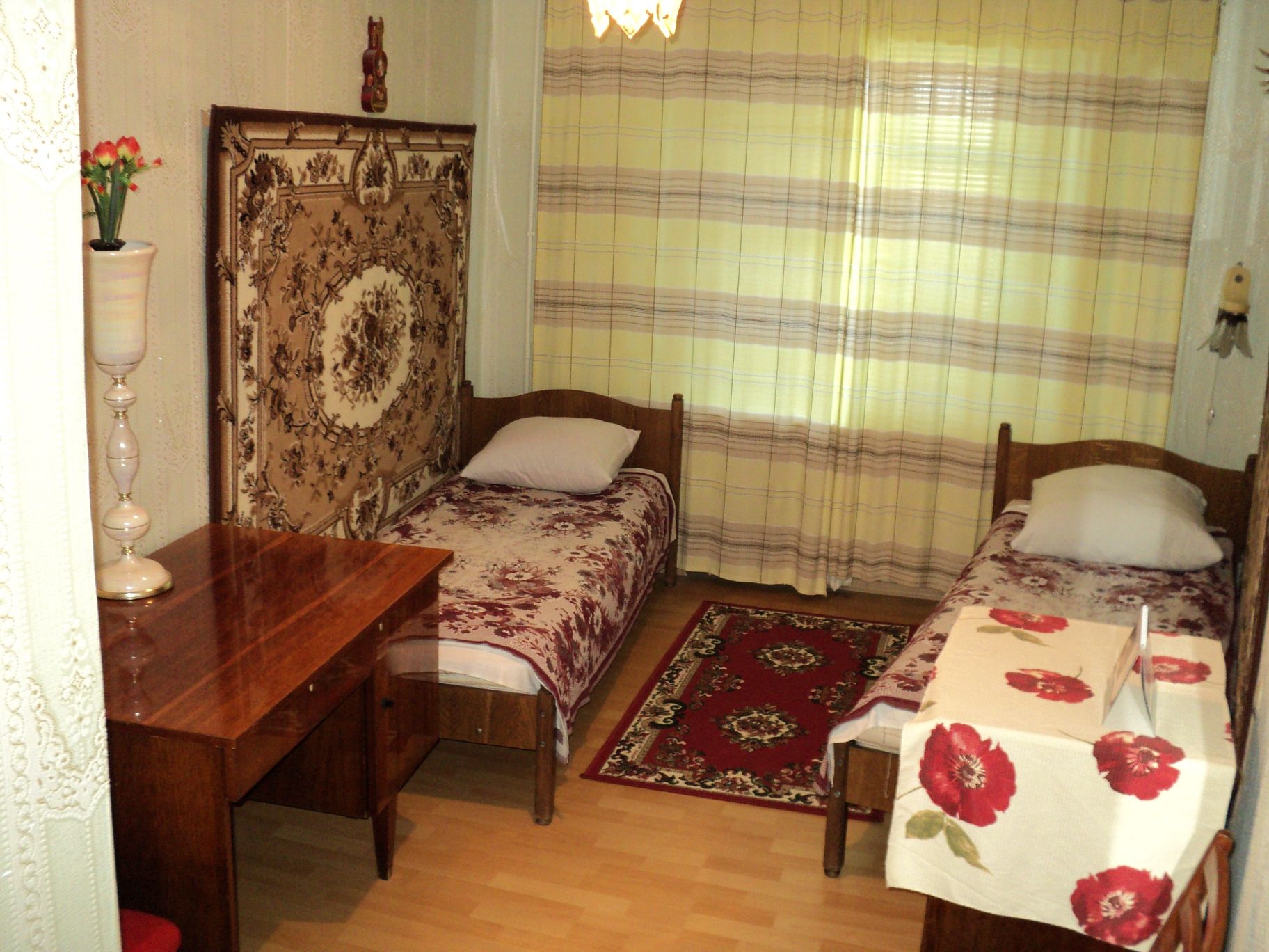 1.Предлагаю двухкомнатную (трехкомнатную) квартиру под ключ в центре Судака с ГАРАЖОМ, ул Октябрьская 36 тихий, большой закрытый двор, 50 метров в стороне от центральной улицы. Второй этаж в пятиэтажном доме. Две застекленные лоджии, одна очень большая. Кухня 9 кв.м. Газ постоянно. Бойлер для горячей воды. Кондиционер, прохладно. Все оборудовано автоматическими дополнительными баками для воды поэтому вода есть постоянно. Мебелирована. В обеих комнатах по 2 кровати и друга мебель. Кабельное телевидение, российские каналы, импортный ТВ. До моря 15 мин., до рынка 5 мин. пешком, ближайший продуктовый магазин 50 метров. Рядом фирменный заводской винный магазин. Вечером тишина, двор очень большой, зеленый, окруженный по кругу пятиэтажными домами. Квартира чистая, ухоженная, уютная. Соседи тихие. При желании могу выслать фотографии.