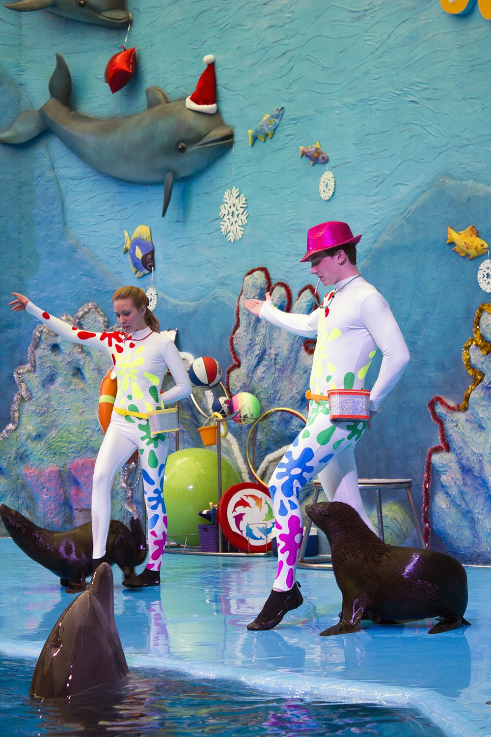 Гвоздь представления – беспрецедентные в мировой практике трюки, в которых одновременно на суше и в воде участвуют дельфины и морские котики.